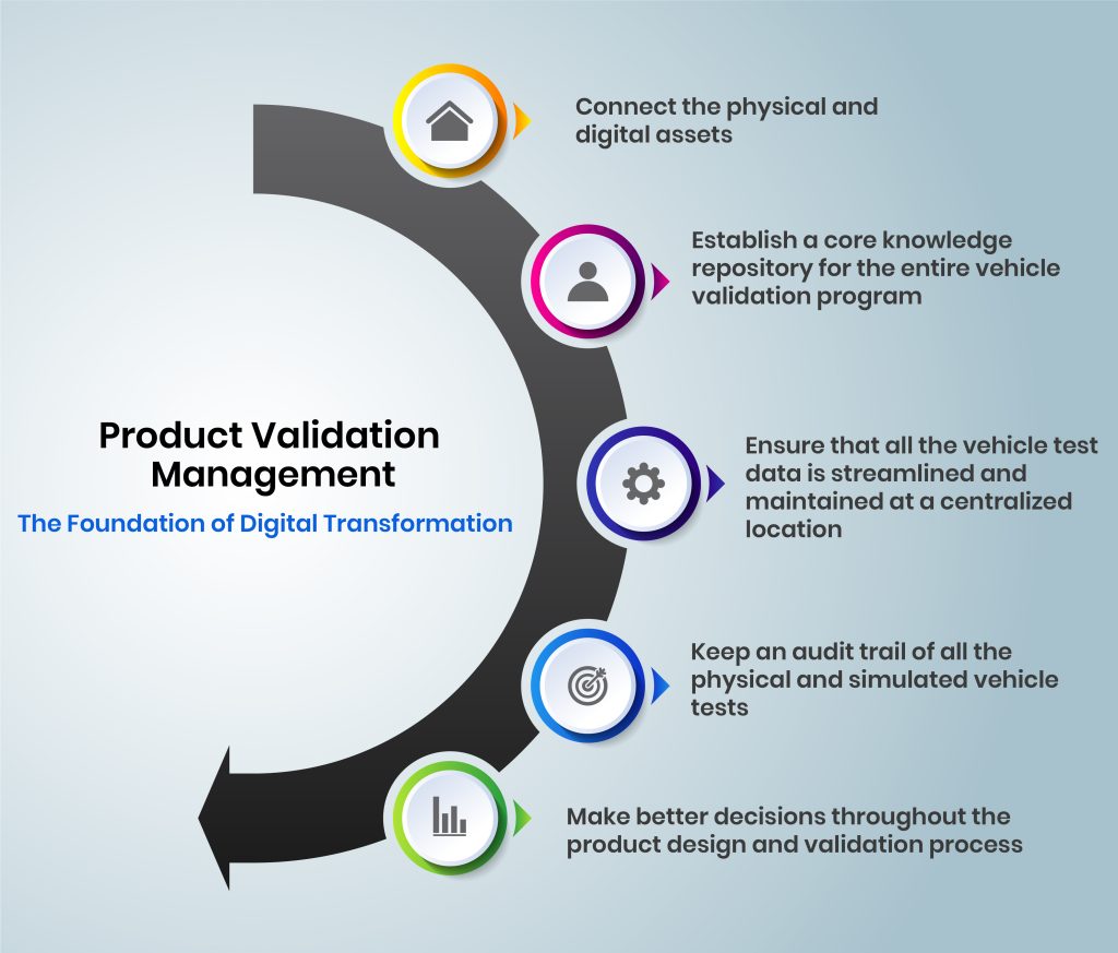 The CASE (Connected, Autonomous, Shared, Electric) revolution is already well underway, and it’s creating a near-insurmountable list of challenges of product validation for companies that are still to get on with such fast-paced innovation. The sheer interconnectedness of the latest vehicles – with their advanced electronics and cutting-edge components – renders them incredibly complex. That apart, the industry is highly regulated as the stakes are high. More than 40% cost of the vehicle development program goes into product validation. However, physical tests take time and are time-consuming and costly. Before getting to production, automakers must validate the performance of their designs in the digital world. After all, it’s impossible to anticipate every aspect of a vehicle’s functionality. Besides this, advanced powertrains, sensors, safety systems, etc., are more sensitive than ever to changes in design. That’s due to the tight integration of proprietary technologies, which makes any malfunction in the automotive assembly process all the more catastrophic. However, to accommodate this “tight integration,” stakeholders must access engineering data collected across every step of a vehicle’s life cycle – such as vehicle data, field data, and lab data. This, in turn, means that a holistic approach must be employed and that this data should be checked against real-world performance to prevent any discrepancies from arising. But, in reality, this data is never unified, thus, plaguing both the upstream and downstream. Fragmented operations create disparate engineering data, which isn’t brought under a common umbrella. Hence, there’s no way to test the assumptions or get all stakeholders to validate the design. Indeed, these challenges highlight the importance of PVM and its role in alleviating some of the pains of operating in a more complex manufacturing environment.Product Validation Management – The Foundation of Digital Transformation
